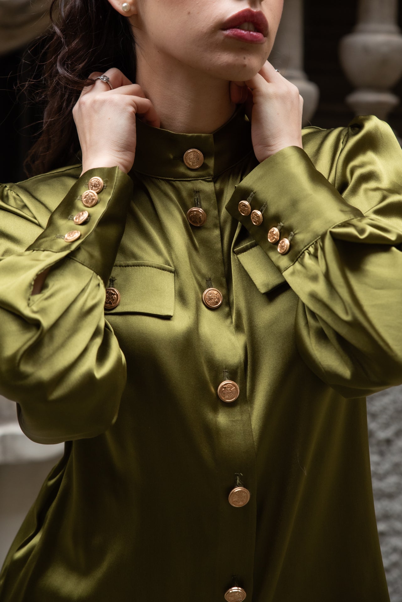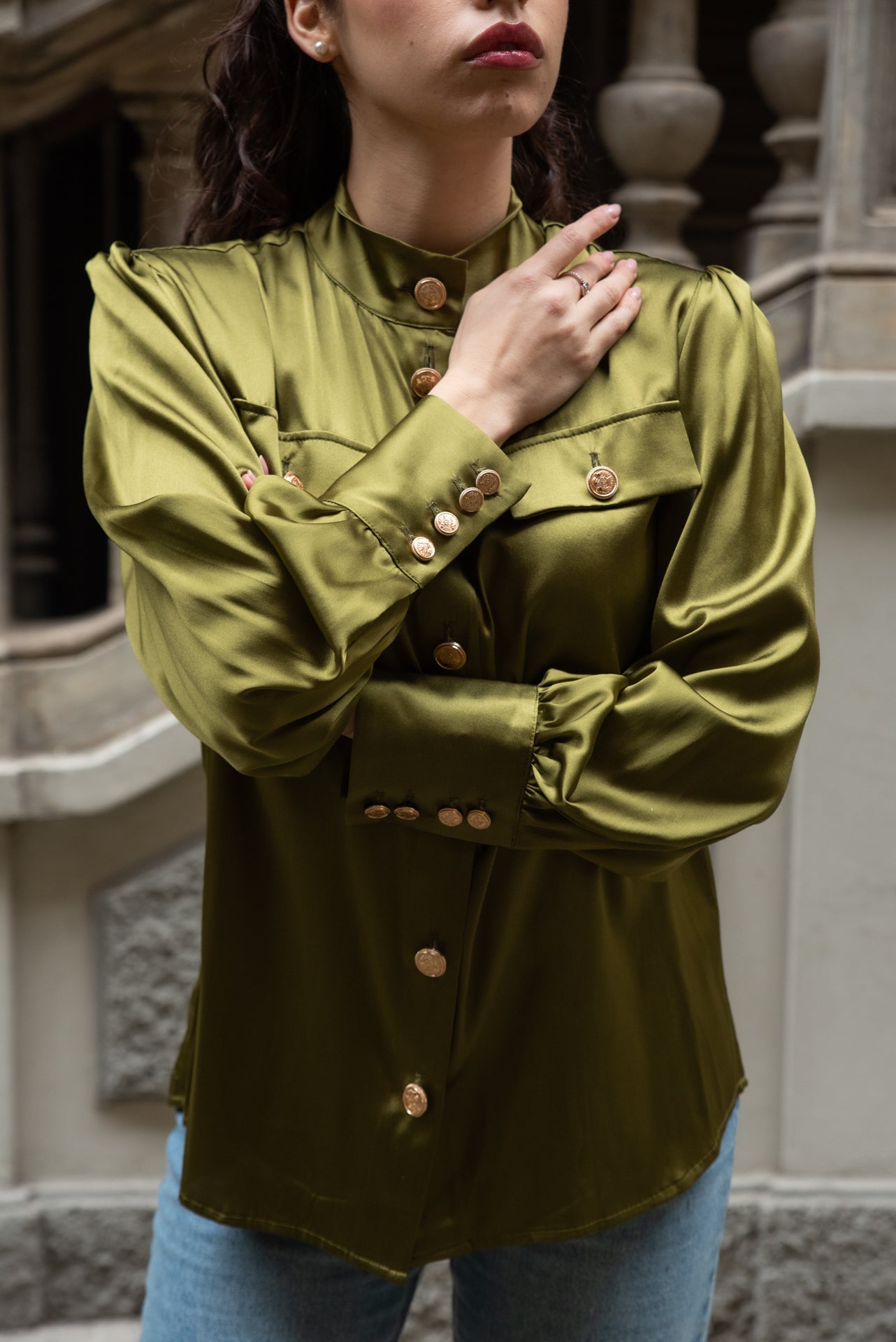 Top in seta strech con tasche sul davanti con grossi bottoni color oro può essere realizzato in 50 colori wup al 3470657811 per visualizzare i colori